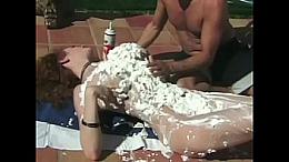 Hot brunette and stud get covered with whipped cream and lick each other by the pool